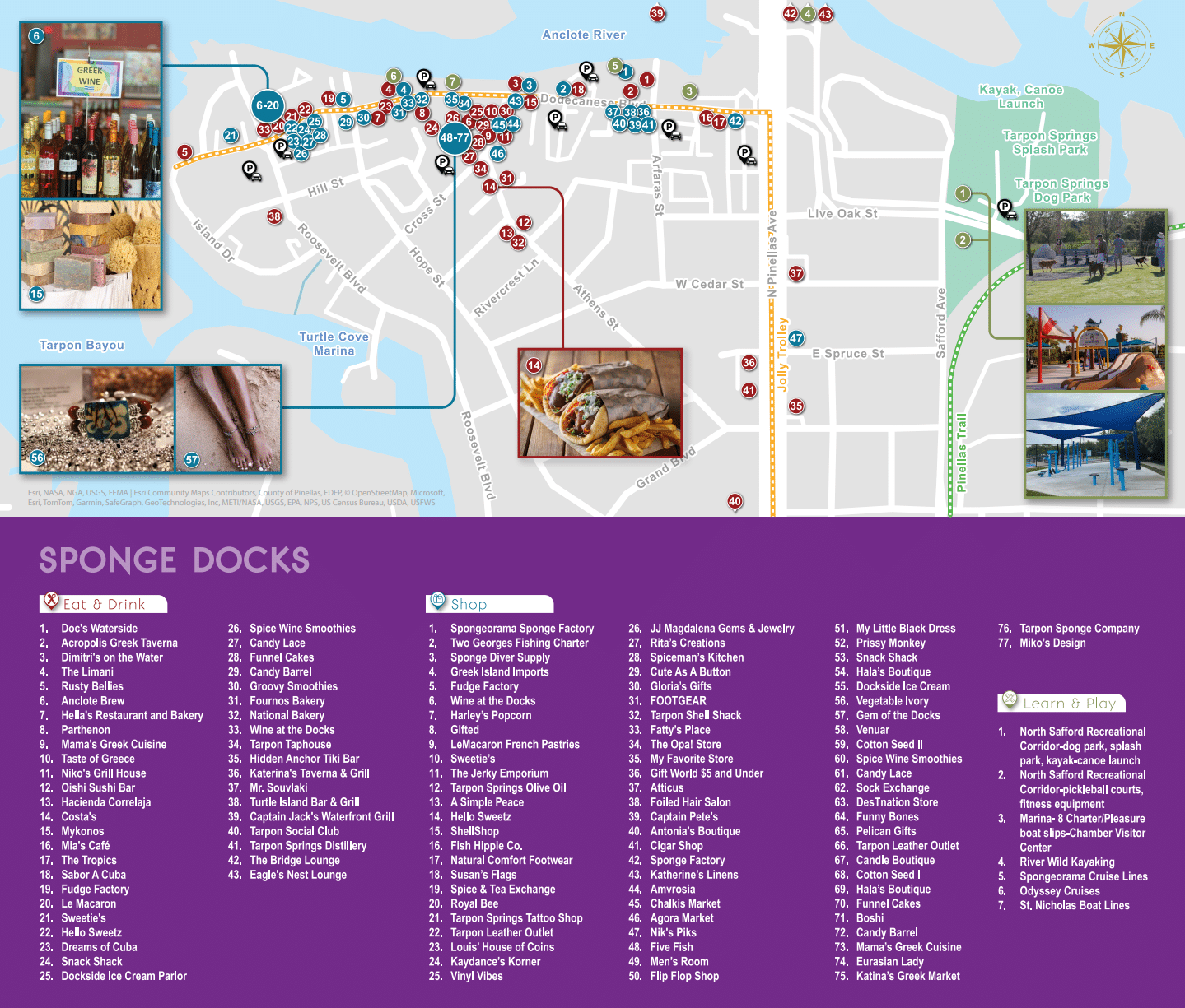 In addition to the sponge diving industry, Greek culture and delicious Greek cuisine, Tarpon Springs is emerging as a diverse cultural destination, rich in art, museums, performing arts, eclectic shopping and dining experiences, and many outdoor recreational activities. Being situated between the Gulf of Mexico and Lake Tarpon, the City boasts multiple beaches and waterfront parks, perfect for fishing, boating, kayaking, shell hunting and more. With public art installations sprinkled throughout and multiple places listed on the National Register of Historic Places, including a historic district and the recognized Greektown district, the city has become a destination for history and art lovers as well.